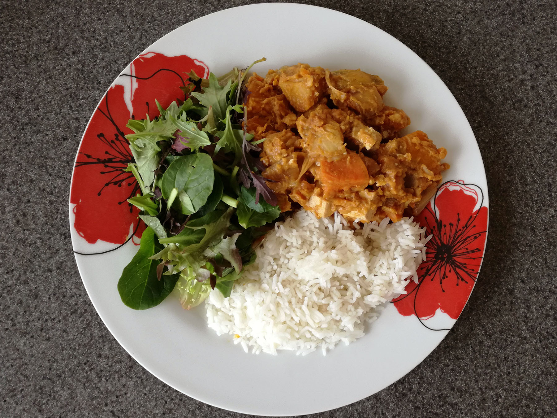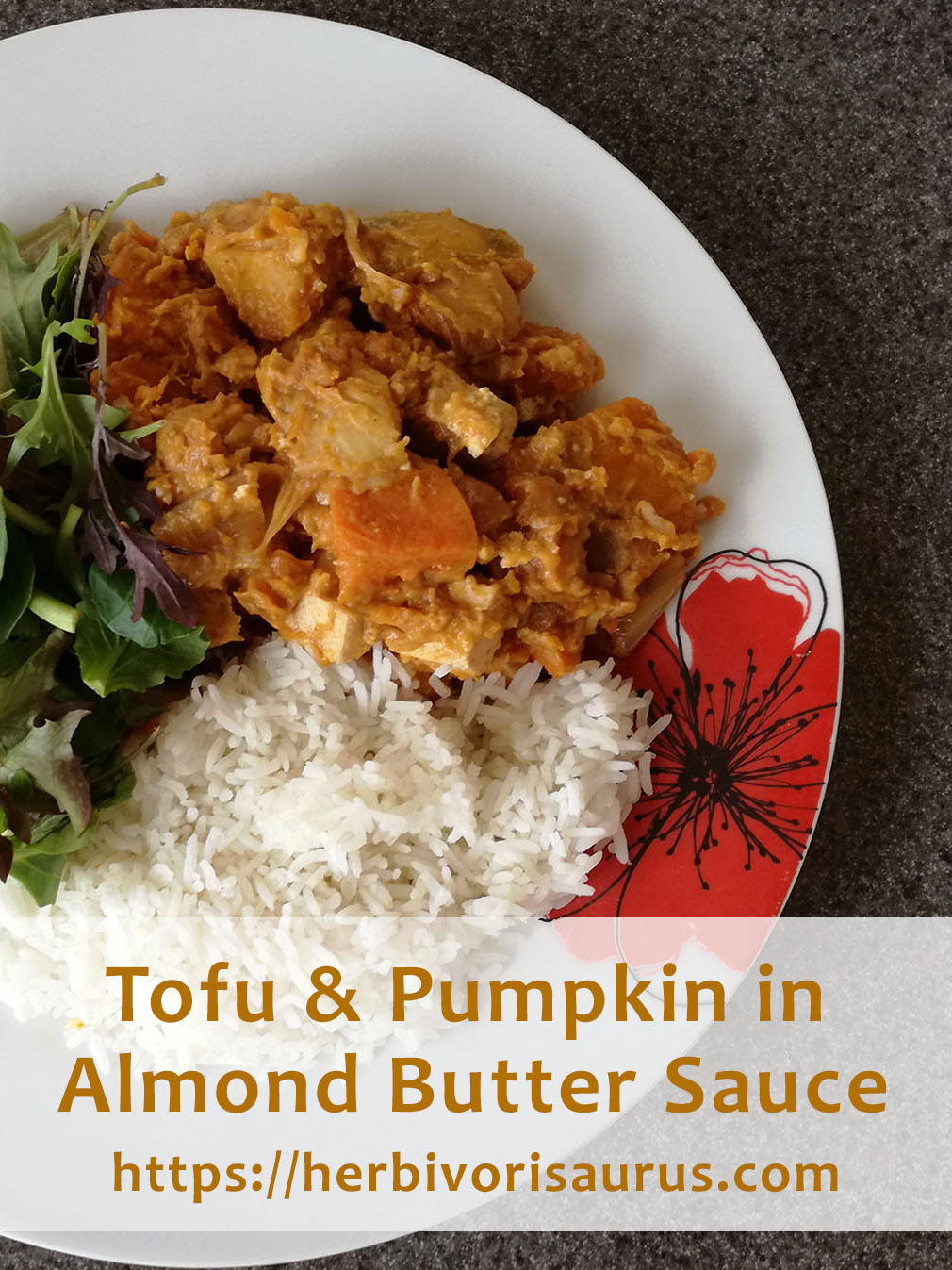 500g pumpkin (about ¼ of a crown pumpkin) 1 medium kumara (sweet potato) 1 onion 1 block of tofu (300g) ⅓ - ½ c of almond butter ⅓ c soy sauce (or tamari for gluten free) ⅓ c cider vinegar 2 Tbsp corn flour or arrowroot 2 Tbsp coconut sugar (or brown sugar) ½ c waterDirections